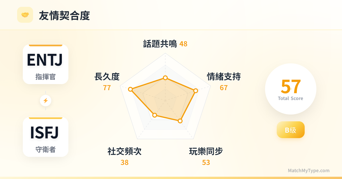 這不是一場充滿詩意與玄學的浪漫邂逅,而是一場基於「供需關係」的穩固聯盟。ENTJ 需要一個穩定的大後方來安放野心,ISFJ 需要一個強大的引領者來提供安全感。只要雙方能跨越溝通方式的巨大鴻溝,這將是最堅不可摧的世俗伴侶。