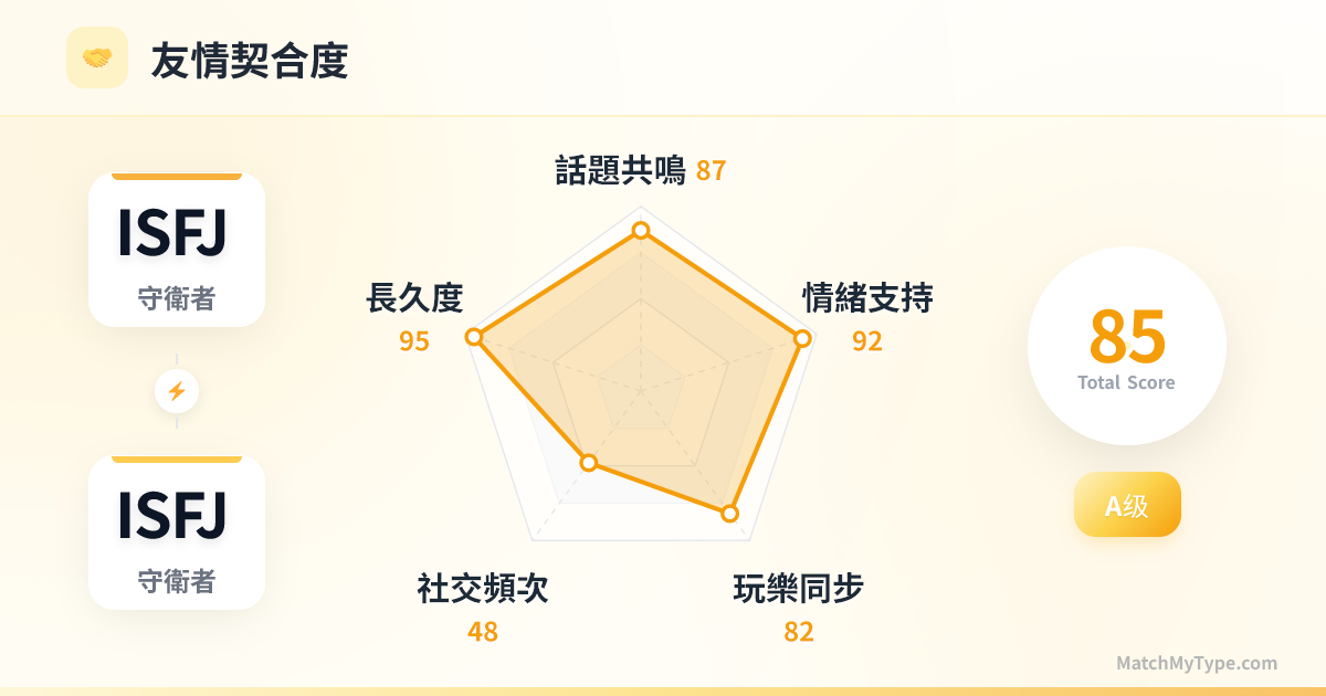 ISFJ 與 ISFJ 的結合,往往不是天雷勾地火的激情,而是「終於找到了那個懂我每一個生活習慣」的安心。你們是彼此最堅實的後盾,構建了一個外人難以插足的溫馨堡壘。但請注意,太多的「相敬如賓」有時會變成「相敬如冰」。