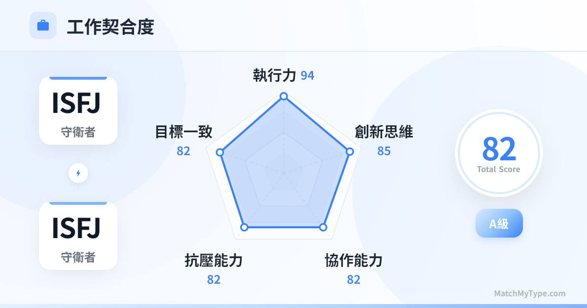 在職場上,ISFJ x ISFJ 是最令人放心的「執行特種部隊」。只要給你們明確的指令和SOP(標準作業程序),你們能把細節做到極致。但在需要腦力激盪或大刀闊斧改革的場景下,這對組合會顯得猶豫不決。