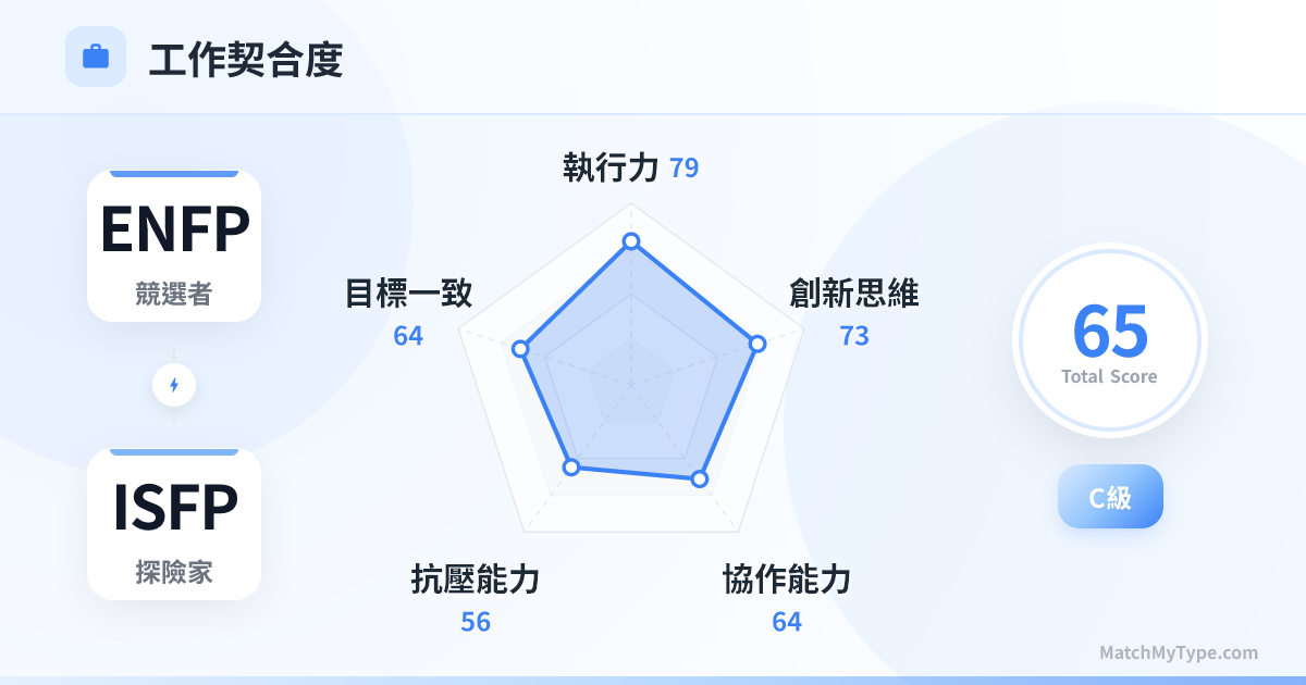 - 溝通雷區ENFP 不要給 ISFP 畫大餅,ISFP 關注的是「現在怎麼做」。ISFP 不要對 ENFP 的點子潑冷水,先肯定創意,再溫和地提出執行難點。