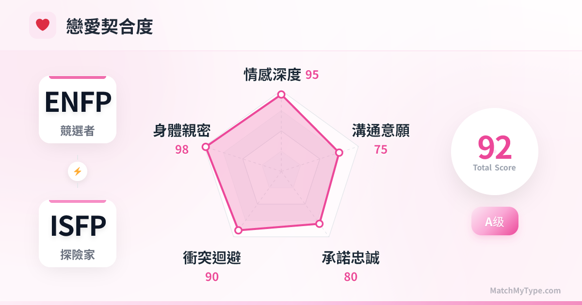 - 3**社交需求差異**:ENFP 需要大量社交來充電,而 ISFP 的社交電量極低。如果 ENFP 強行拉 ISFP 參加太多聚會,ISFP 會崩潰;反之 ENFP 會覺得被困住。