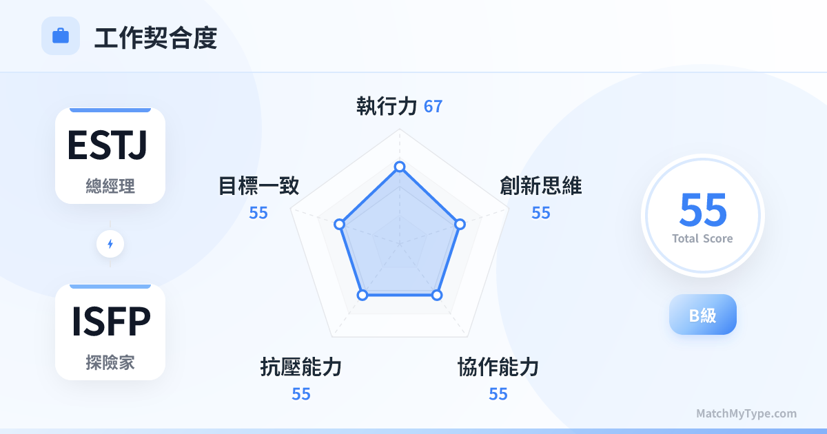 在職場上,這是一對「經理人」與「匠人」的組合。ESTJ 負責搭台子、定規則、搞銷售,ISFP 負責打磨產品、設計美學、提供人文關懷。只要放對位置,就是黃金搭檔;放錯位置,就是互相折磨。