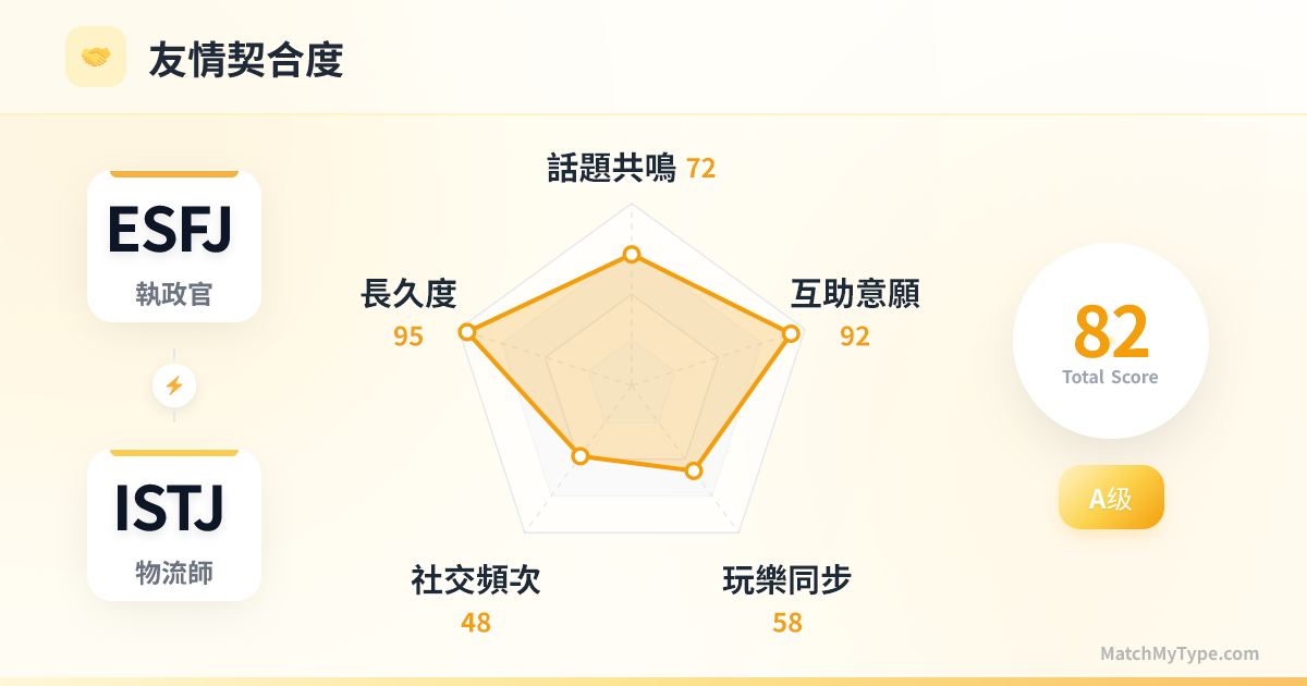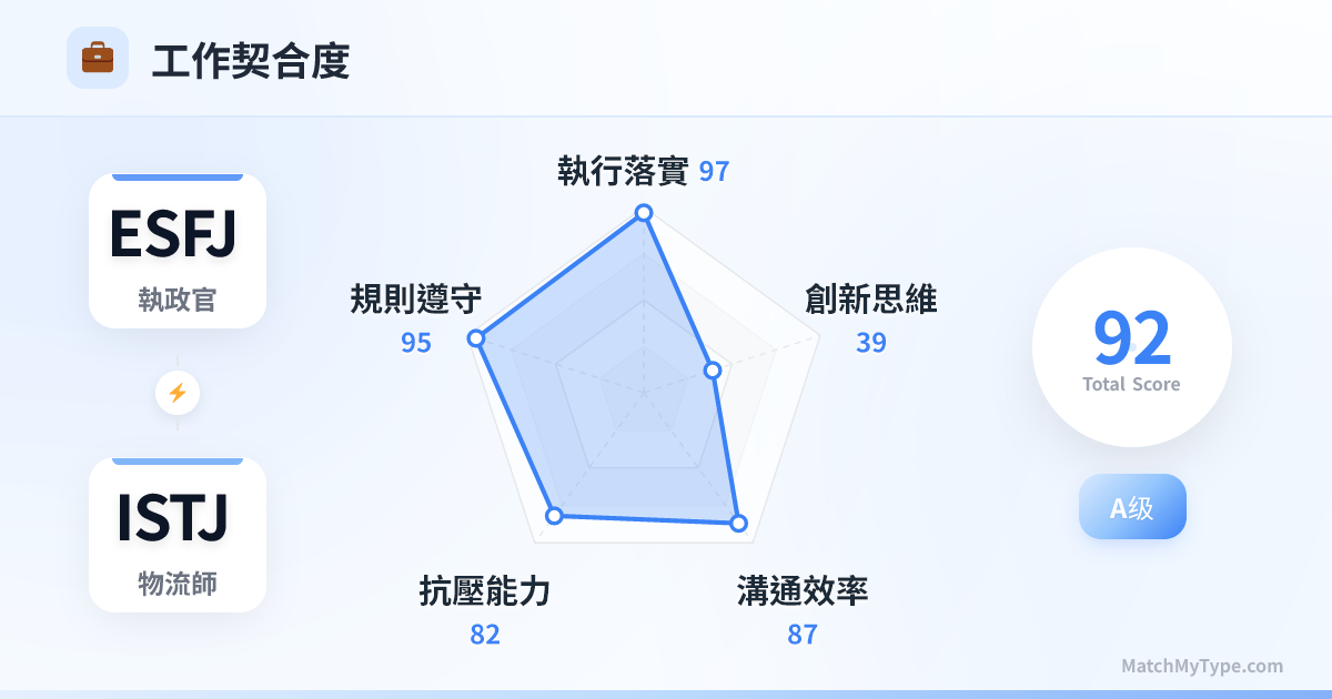 這是職場上最讓人放心的「落實組合」。如果說 ENFP 和 ENTP 負責畫大餅,那 ESFJ 和 ISTJ 就是負責把餅做出來的人。你們是公司的基石,是流程的守護者,是執行力的代名詞。