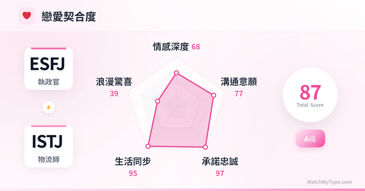 吸引力往往來自於「安全感」和「互補」。ESFJ 會被 ISTJ 的沉穩、靠譜和井井有條所吸引,覺得這個人是可以託付終身的;ISTJ 則會被 ESFJ 的熱情、周到和社交能力所打動,ESFJ 就像一道光照進了 ISTJ 略顯枯燥的生活,幫他們處理那些令人頭疼的人際關係。你們都喜歡確定的未來,都不喜歡玩心理遊戲,這種坦誠讓關係迅速升溫。