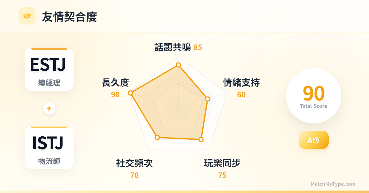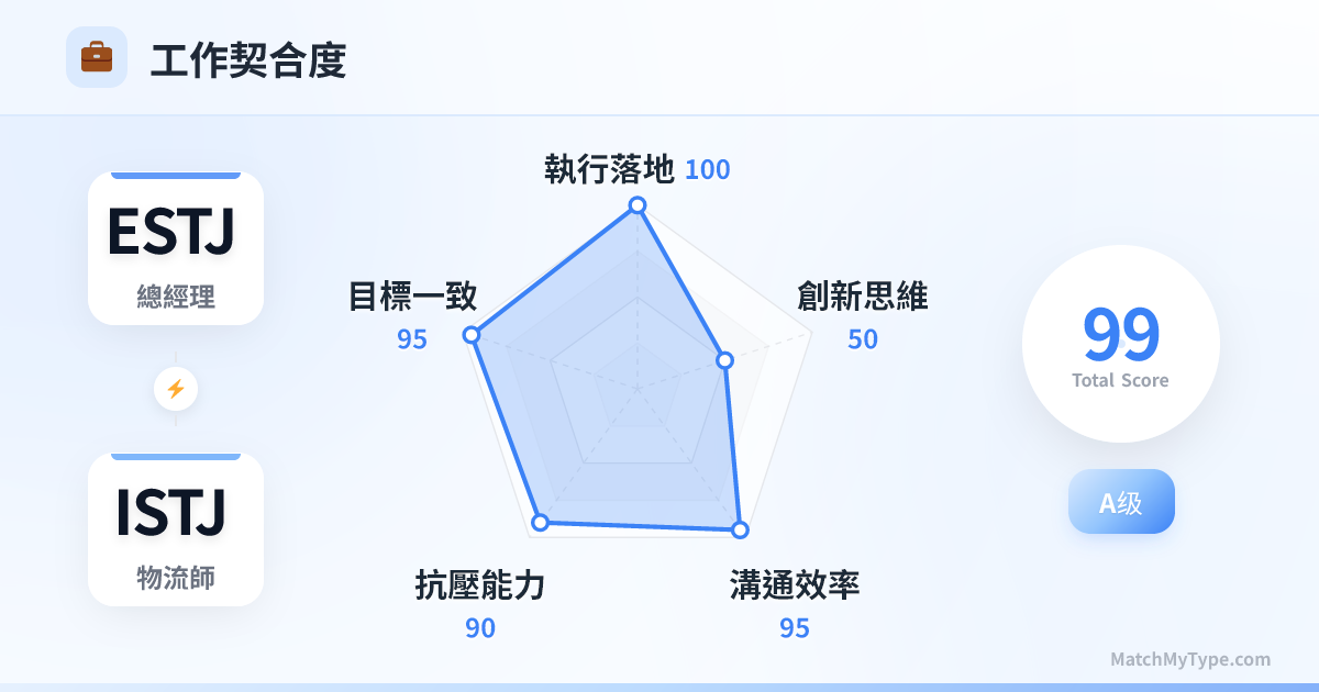 完美的「前台與後台」搭配。ESTJ 擅長制定戰略、對外談判、統籌大局;ISTJ 擅長審核細節、流程控制、風險管理。ESTJ 敢於衝鋒陷陣,ISTJ 確保糧草先行。在財務、法律、工程、行政等需要嚴謹和規則的領域,你們是無敵的。