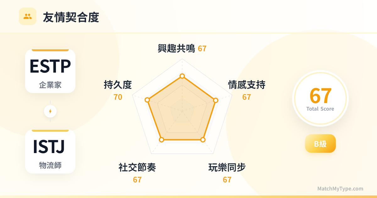ESTP 和 ISTJ 的結合,就像是「火焰」遇到了「岩石」。ESTP 試圖點燃生活,ISTJ 試圖築基未來。這不是那種風花雪月的浪漫劇,而是一部充滿動作場面和生活瑣事的實景紀錄片。只要協調好「變」與「不變」,你們就是最穩固的利益共同體。