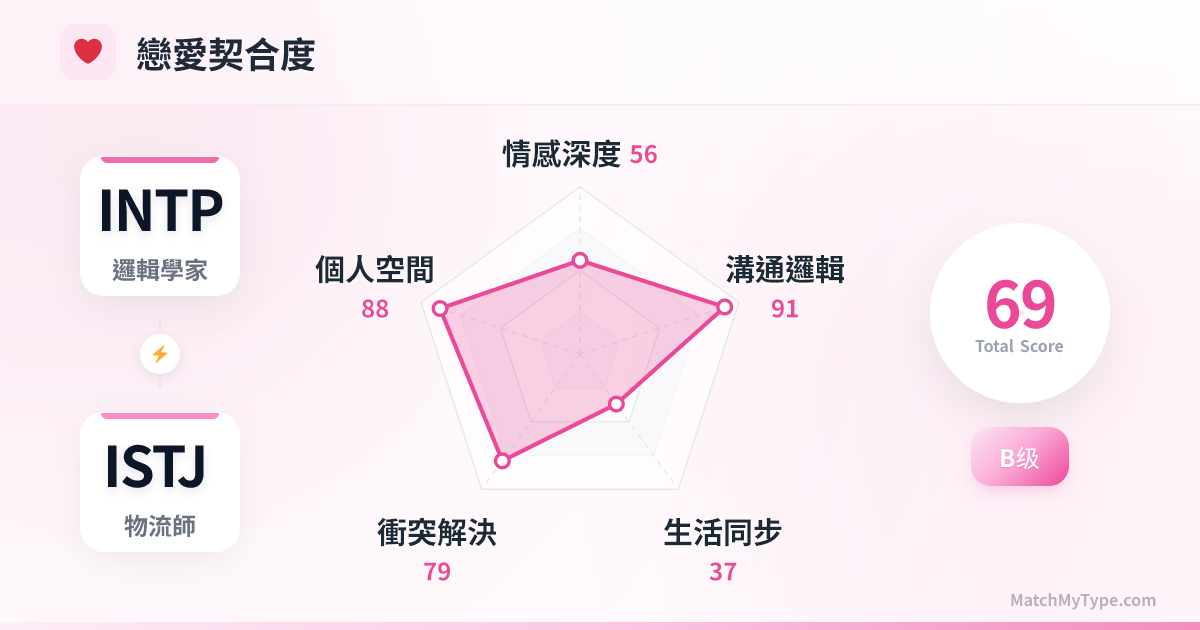這不是那種充滿了鮮花、蠟燭和戲劇性表白的戀愛,而更像是一場關於「如何高效共存」的長期實驗。INTP 和 ISTJ 都不擅長處理情緒,但都極其看重忠誠、邏輯和承諾。你們的愛意不體現在「我愛你」的言語中,而體現在幫對方修好電腦、整理好稅務報表這些實實在在的行動裡。