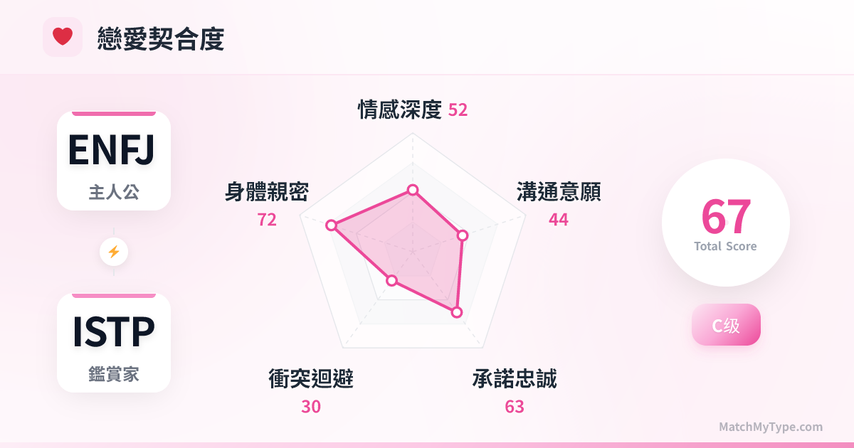 最大的危機在於**溝通頻率**。ENFJ 需要大量的語言確認和情感交流,而 ISTP 認為「我不離開就是愛你,別問了」。這種差異容易導致 ENFJ 感到被冷落,從而爆發情緒,進一步嚇退 ISTP。
