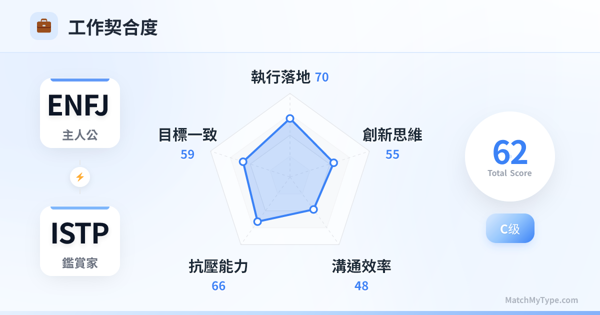這組關係的張力來源於 **Fe (外向情感)** 與 **Ti (內向思考)** 的極限拉扯: **Fe (ENFJ 主導) x Ti (ISTP 主導)**:ENFJ 追求和諧、大家開心,做決定基於價值觀;ISTP 追求真理、邏輯自洽,做決定基於事實。ENFJ 覺得 ISTP 「冷血、像個機器人」,ISTP 覺得 ENFJ 「虛偽、戲太多」。但正因為相反,ENFJ 能幫 ISTP 處理搞不定的人際關係,ISTP 能幫 ENFJ 拆解複雜邏輯問題,形成完美閉環。 **Ni (ENFJ 輔助) x Se (ISTP 輔助)**:這是兩人的共同語言。ENFJ 的願景 (Ni) 需要 ISTP 的行動力 (Se) 來落實。兩人都喜歡「體驗」生活,ISTP 帶 ENFJ 玩刺激的(賽車、衝浪),ENFJ 賦予這些活動深層的意義。
