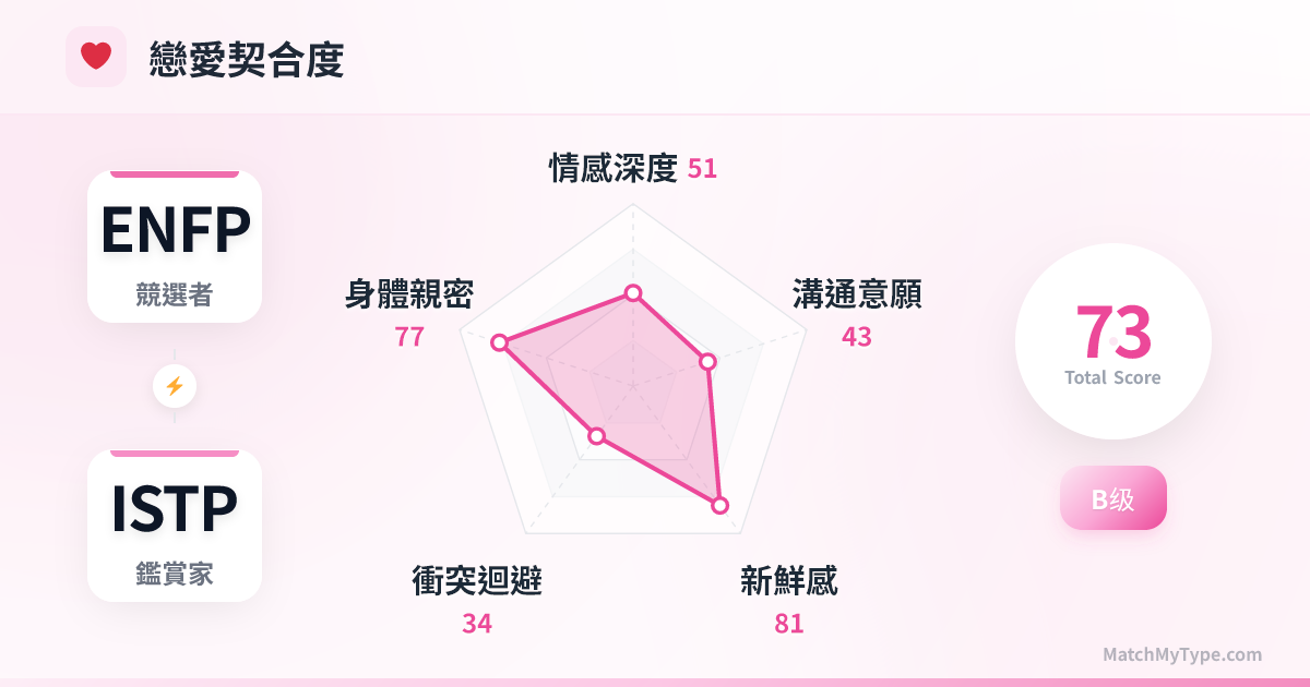 - 3**承諾恐懼症**:ENFP 喜歡規劃未來(Ne),ISTP 喜歡活在當下(Se)。當 ENFP 逼問「我們要不要結婚/買房」時,ISTP 可能會表現出猶豫,讓 ENFP 極度不安。