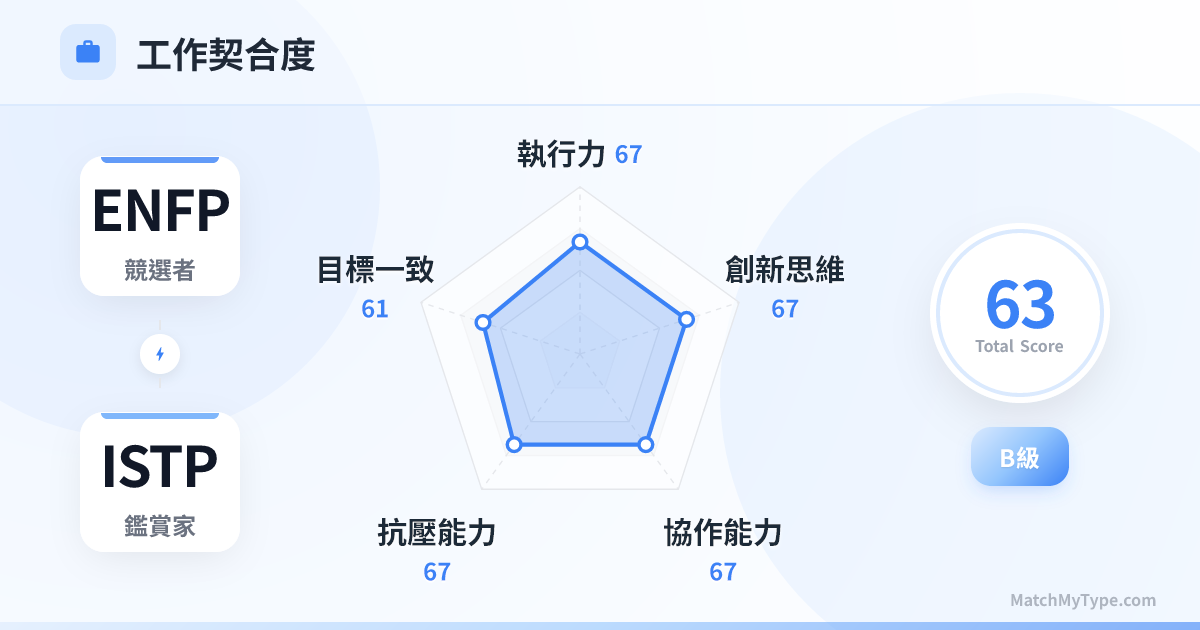 互補但需隔離。ENFP 負責對外溝通和腦力激盪,ISTP 負責對內執行和技術攻關。開會時,ENFP 負責活躍氣氛,但做會議紀錄和定 Deadline 這種事最好交給 ISTP(或者找個第三方 J 人),否則兩人很容易聊得很嗨但啥也沒定下來。