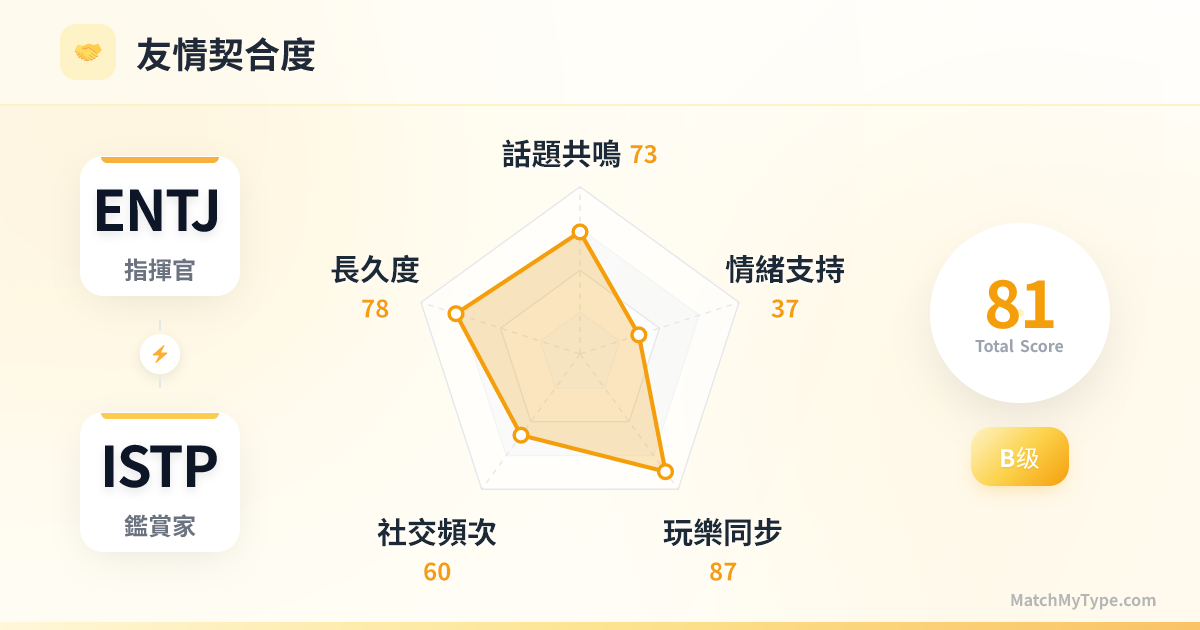 ENTJ 是社交場上的中心,喜歡組局;ISTP 是角落裡的觀察者,喜歡溜掉。做朋友時,ENTJ 不要強行把 ISTP 拉到聚光燈下介紹給所有人,這會讓 ISTP 尷尬癌發作。最好的相處模式是「搭子」:一起做完某項活動,然後各回各家,不需要過多的情感寒暄。