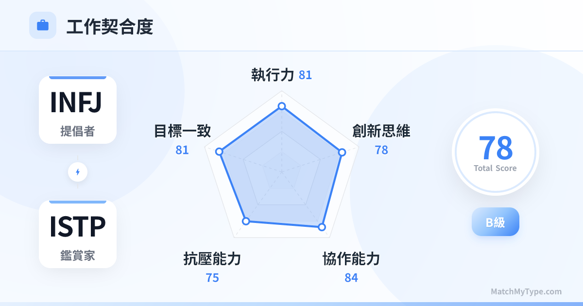 互不打擾的高效搭檔。INFJ 負責寫報告、做匯報、搞定客戶關係;ISTP 負責做數據、修 Bug、搞定技術難題。只要別強迫對方用自己的方式工作,就是天下太平。