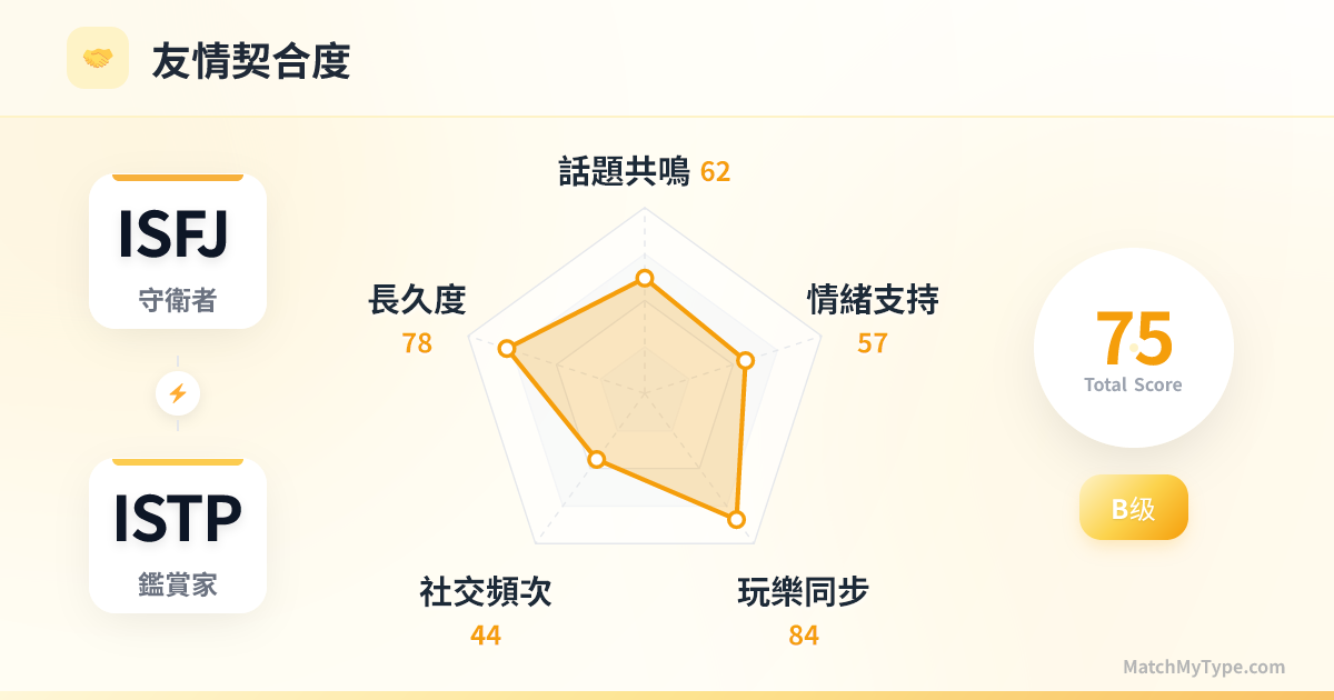 井水不犯河水的高效。只要分工明確,你們是最省心的搭檔。ISFJ 負責前半段的資料收集和整理,ISTP 負責中間的處理和分析,最後由 ISFJ 負責後期的彙報和歸檔。千萬別讓 ISTP 去做客戶安撫工作,也別讓 ISFJ 去做緊急搶修。
