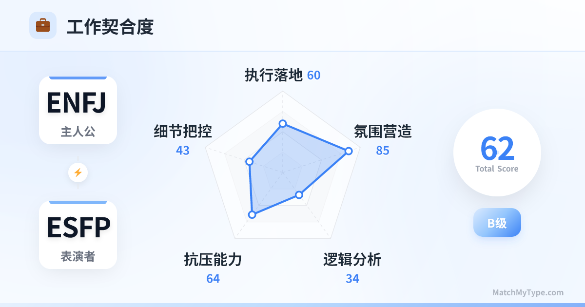 摸鱼搭档。如果你们坐在一起,工作效率可能会减半,因为聊天太开心了。最好的合作方式是:ENFJ 负责制定流程和对外沟通,ESFP 负责执行那些需要灵活应变和展示个人魅力的环节。