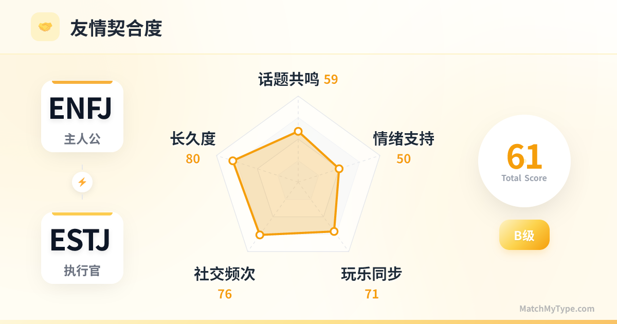你们的友谊建立在共同的活动和圈子上。你们都是外向者(E),都喜欢热闹和组织活动。你们是朋友圈里的“活动委员会”,一个负责拉群喊人(ENFJ),一个负责订餐厅做攻略(ESTJ)。