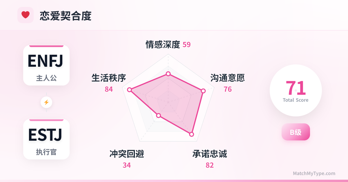 这是一场 **Fe (外倾情感)** 与 **Te (外倾思考)** 的巅峰对决: **Fe (ENFJ) x Te (ESTJ)**:这是关系中最大的矛盾来源,也是最大的互补点。ENFJ 做决定时问“大家会开心吗?”,ESTJ 做决定时问“这有效率吗?”。ENFJ 觉得 ESTJ 冷酷无情、像个机器;ESTJ 觉得 ENFJ 优柔寡断、感情用事。但如果配合得好,ENFJ 负责“外交”和“士气”,ESTJ 负责“内政”和“财政”,将无坚不摧。 **Ni (内倾直觉) x Si (内倾感觉)**:ENFJ 喜欢谈论未来的愿景和改变(Ni),而 ESTJ 喜欢依赖过去的经验和传统(Si)。ENFJ 可能会觉得 ESTJ 过于守旧、死板;ESTJ 可能会觉得 ENFJ 的想法不切实际、好高骛远。你们需要学会在“仰望星空”和“脚踏实地”之间找到平衡。