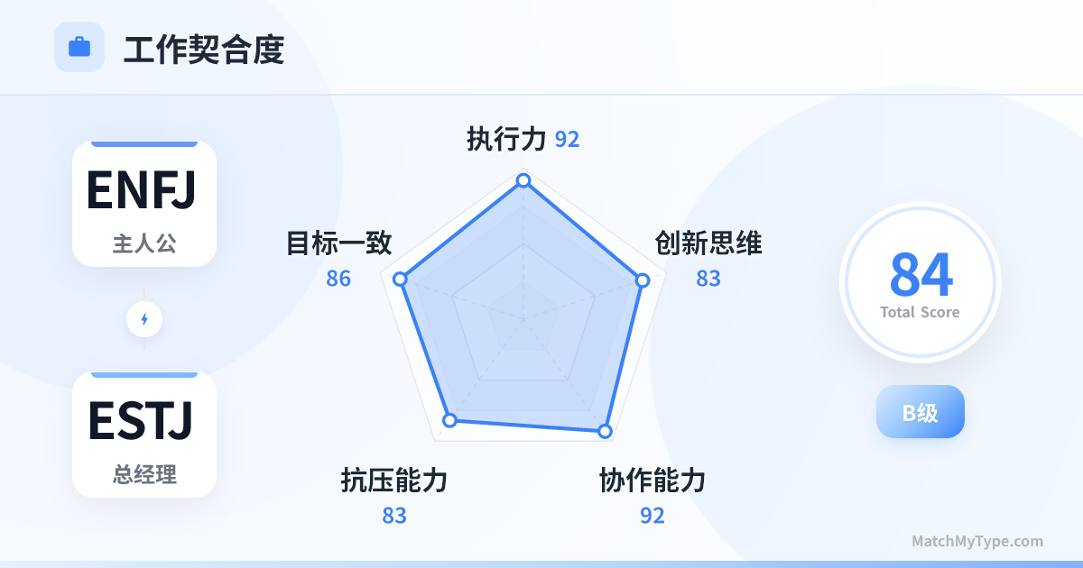 最佳搭档。一个主外(ENFJ 搞定客户关系、路演),一个主内(ESTJ 搞定项目交付、流程合规)。只要划分好权责边界,不要在对方的领域指手画脚,效率将是惊人的。