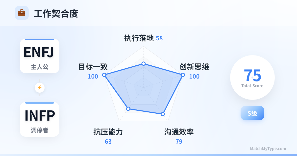 物理隔离是保持效率的关键。如果坐在一起,你们可能会聊一整天的人生哲学而忘记工作。建议分工明确:ENFJ 负责对外路演、搞定客户、跨部门协调;INFP 负责对内打磨产品、撰写文案、设计视觉。不要一起做需要严谨逻辑的数据分析工作。