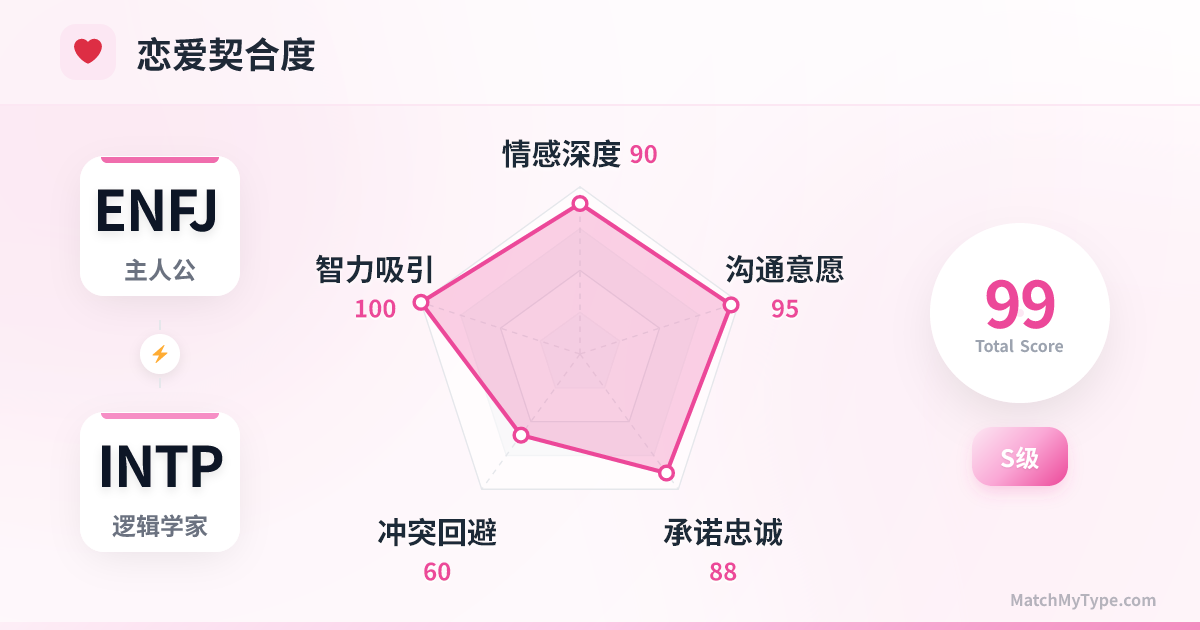 MBTI 理论中著名的「黄金配对」(Golden Pair)。ENFJ 拥有 INTP 渴望却笨拙的温暖社交能力,INTP 拥有 ENFJ 崇拜却缺乏的严密逻辑内核。这是一种基于“缺失互补”的致命吸引力,ENFJ 想要照顾这个聪明的“傻瓜”,而 INTP 想要研究这个温暖的“谜题”。