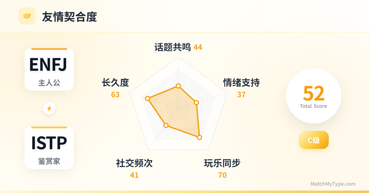 完全相反。ENFJ 充电靠聚会,ISTP 充电靠独处。做朋友时,ENFJ 往往是那个“组局者”,而 ISTP 是那个“很难约但来了就能镇场子”的高手。ENFJ 切忌强行拉 ISTP 去全是陌生人的尴尬社交局,ISTP 会当场社死或逃跑。