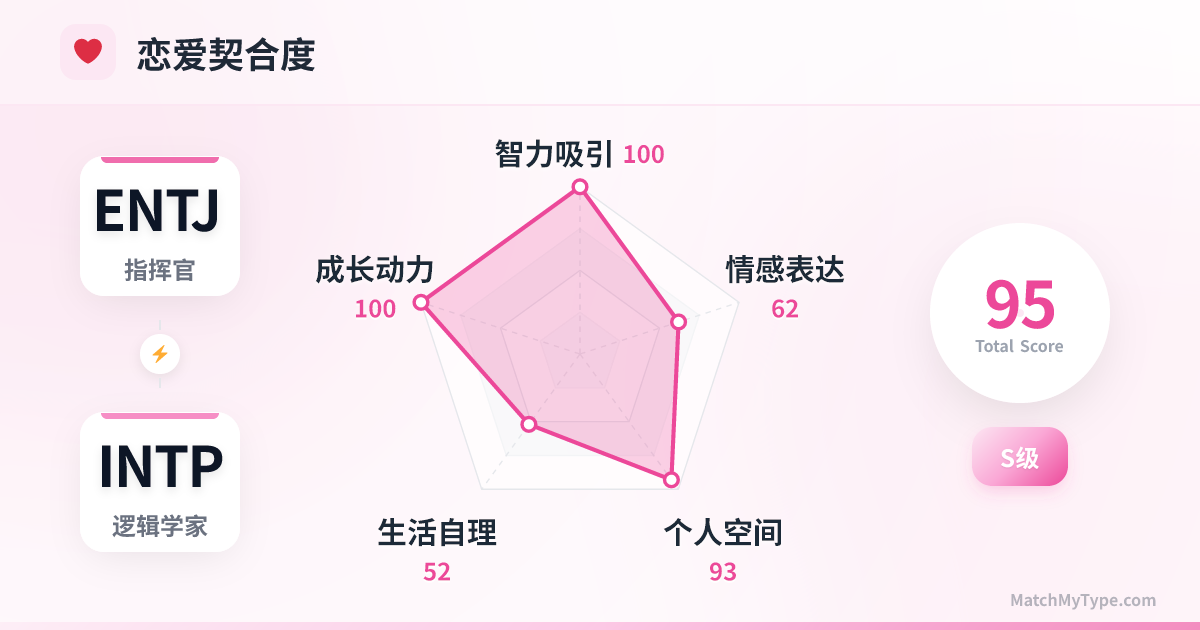 这是一场「征服者」与「隐士」的博弈。ENTJ 习惯掌控一切,却惊讶地发现 INTP 的思维像水银泻地般难以捉摸且无懈可击,这种“无法完全掌控的智力挑战”瞬间点燃了 ENTJ 的征服欲。而 INTP 常常觉得周围的人类既愚蠢又无趣,直到遇到 ENTJ——一个不仅能听懂他们复杂的逻辑,还能帮他们把脑中蓝图变成现实的强者。INTP 在 ENTJ 身上看到了自己缺失的行动力,ENTJ 在 INTP 身上看到了自己渴望的真理。