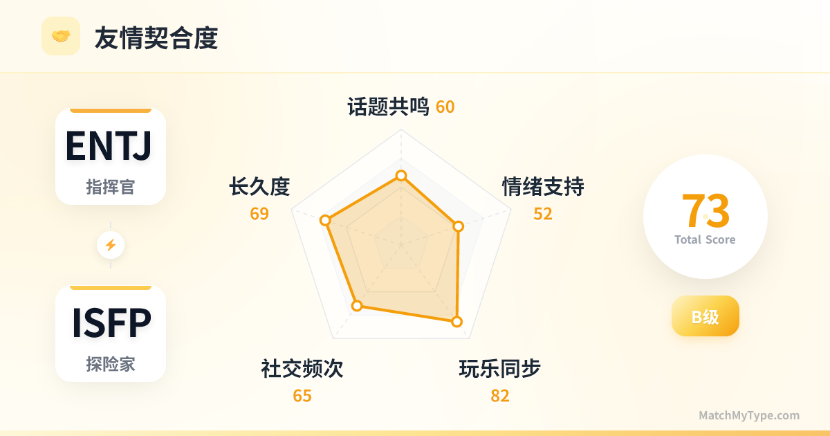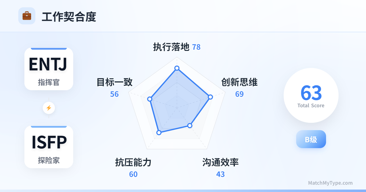 在职场中,这是“制片人”与“导演”的关系。ENTJ 负责拉投资、定排期、搞定发行;ISFP 负责打磨镜头、把控审美、注入灵魂。只要互不越界,就是黄金搭档。