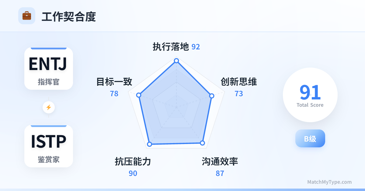 这是职场上的“梦之队”。ENTJ 是那个在发布会上画饼的 CEO,ISTP 就是那个在后台把产品敲出来的首席架构师。只要目标一致,没有你们攻不下的山头。