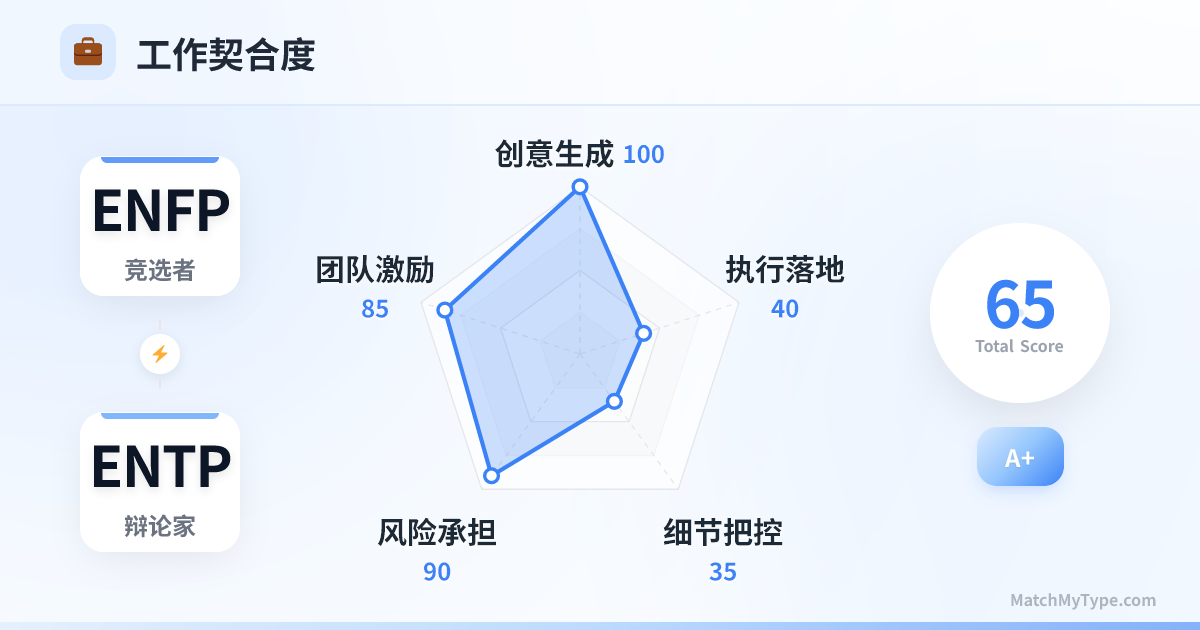 创新无敌。ENFP 擅长把握市场情绪和用户痛点,ENTP 擅长构建商业模式和技术逻辑。你们是产品研发初期最完美的搭档,能够打破常规,想出竞争对手完全想不到的切入点。