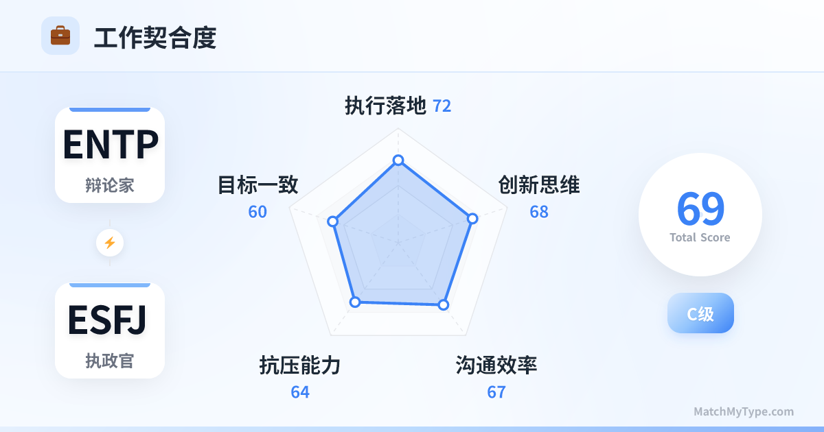 ENTP 需要收敛攻击性,少用反问句;ESFJ 需要收敛情绪化,少用“我觉得你不在乎我/团队”这类主观词汇。回归事实本身讨论。