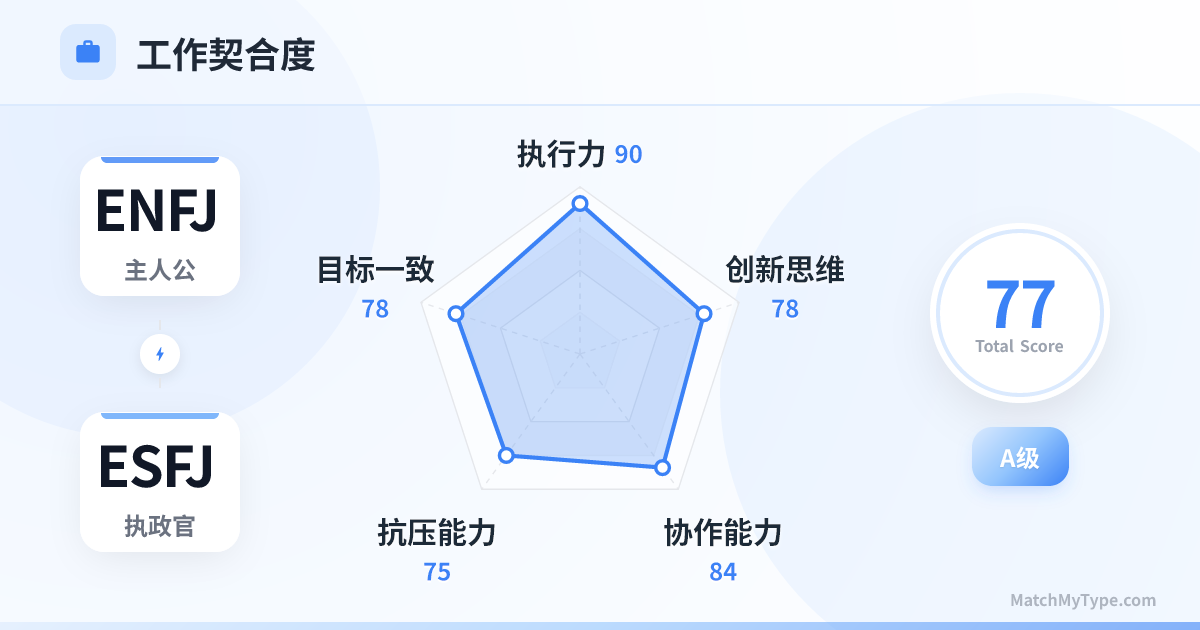 在职场上,这是“CEO 与 COO”或者“政委与后勤部长”的黄金搭档。ENFJ 负责画饼、动员、搞定外部关系;ESFJ 负责分饼、执行、搞定内部流程。只要方向一致,你们的团队将兼具凝聚力和执行力。