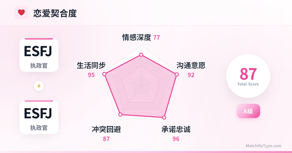 这是一场“照镜子”般的相遇。ESFJ 终其一生都在照顾他人,往往忽略了自己,而当遇到另一个 ESFJ 时,他们第一次体会到了“被别人像我照顾别人那样照顾”的感动。双方都极其重视仪式感、节日庆祝和家庭聚会,这种对生活热情的同频共振,会让你们迅速认定对方就是那个可以携手走过一生的伴侣。