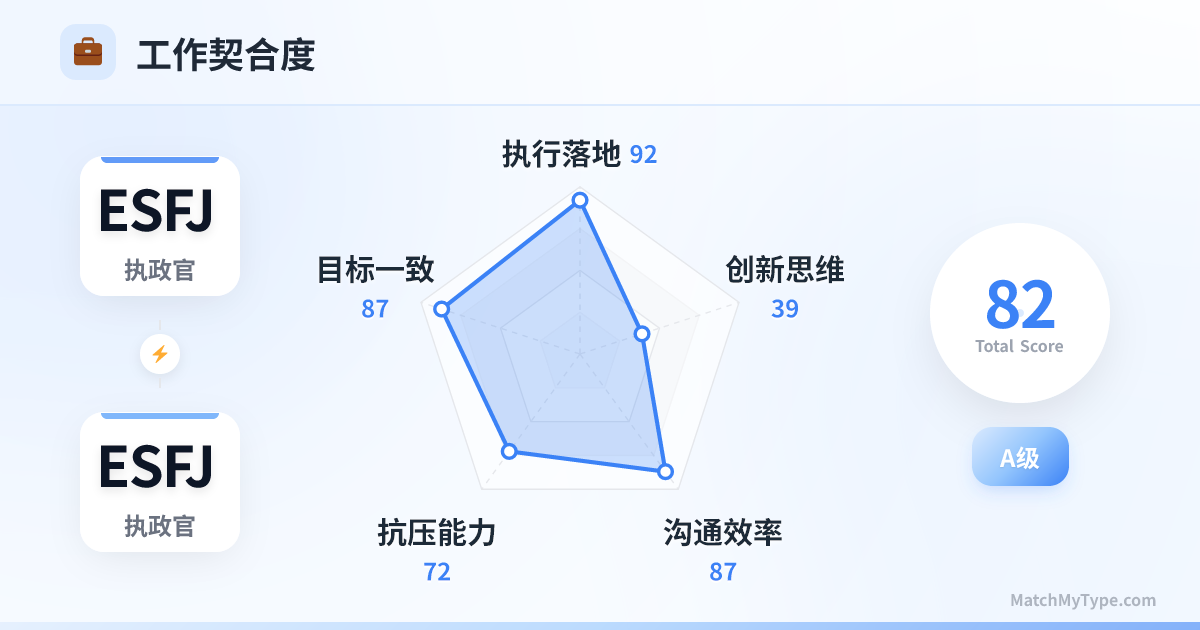 如果一个团队里有两个 ESFJ,那么这个团队的行政效率、活动组织能力和氛围将会是顶级的。你们是天生的执行者和粘合剂,但在需要大刀阔斧改革或进行抽象战略规划时,可能会遇到瓶颈。