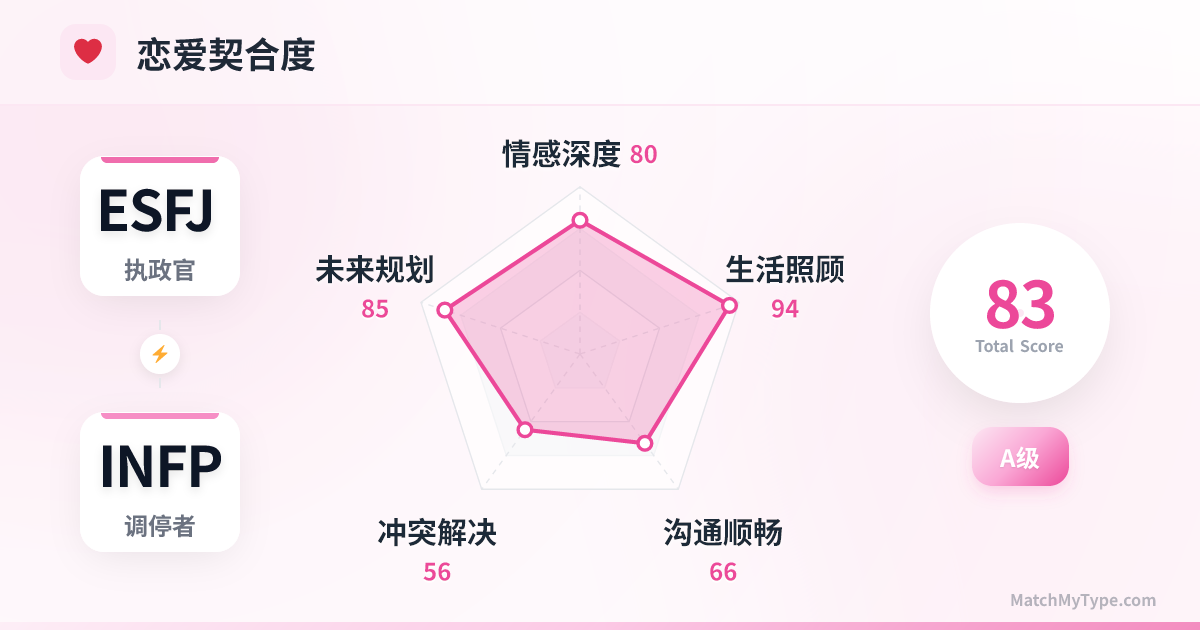 ESFJ 和 INFP 的组合就像是“热牛奶加蜂蜜”,温暖、甜美且治愈。ESFJ 渴望照顾他人,而 INFP 常常生活自理能力掉线且渴望被呵护,这种供需关系构成了两人极强的初始吸引力。但随着时间推移,现实主义与理想主义的摩擦在所难免。