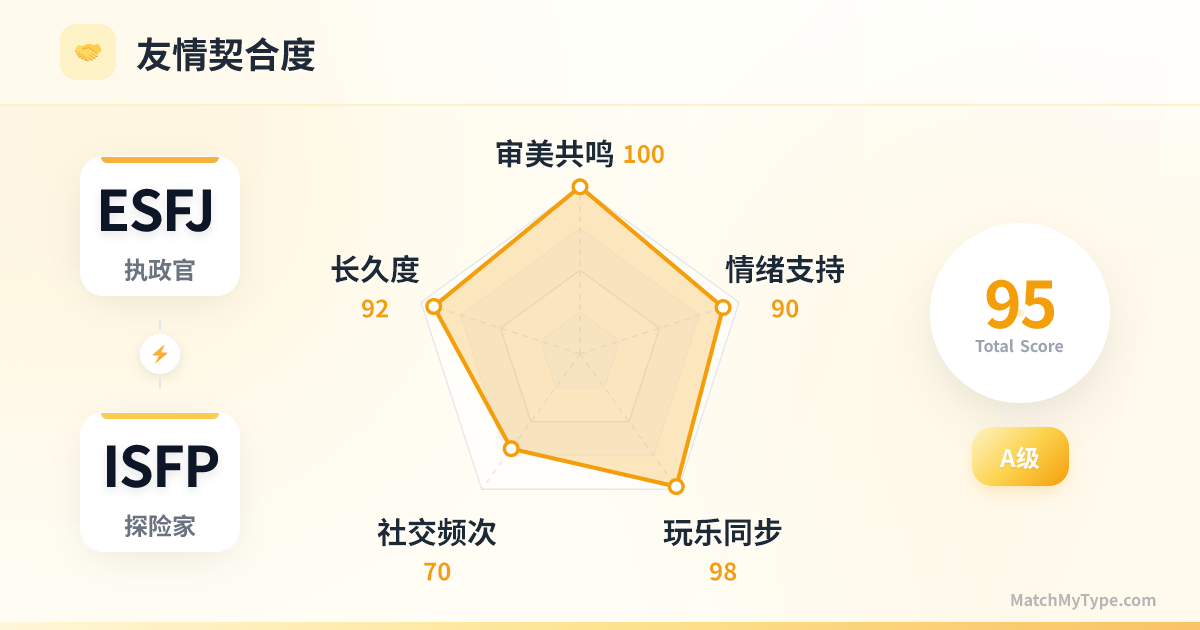你们是最佳的“吃喝玩乐”搭档。没有哪对组合比 ESFJ 和 ISFP 更懂得如何享受当下的物质生活了。只要不谈论过于沉重的逻辑话题,你们的友谊可以天长地久。