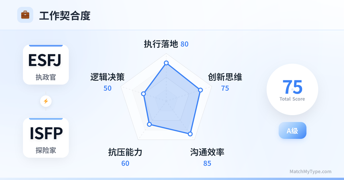 保姆式管理。ESFJ 老板会非常照顾 ISFP 员工的情绪,甚至送零食、嘘寒问暖。但要注意,不要试图把 ISFP 变成和你一样的社交达人,也不要强迫他们在会议上公开发言。给他们一个安静的角落,他们会还你惊艳的作品。