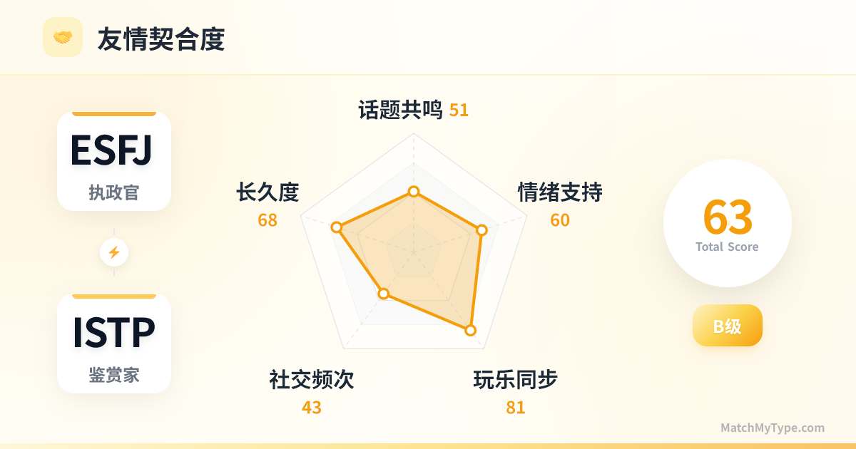这是一对极其高效的“实干组合”。ESFJ 擅长搞定“人”,ISTP 擅长搞定“事”。只要分工明确,你们能构建出既有凝聚力又有战斗力的团队。