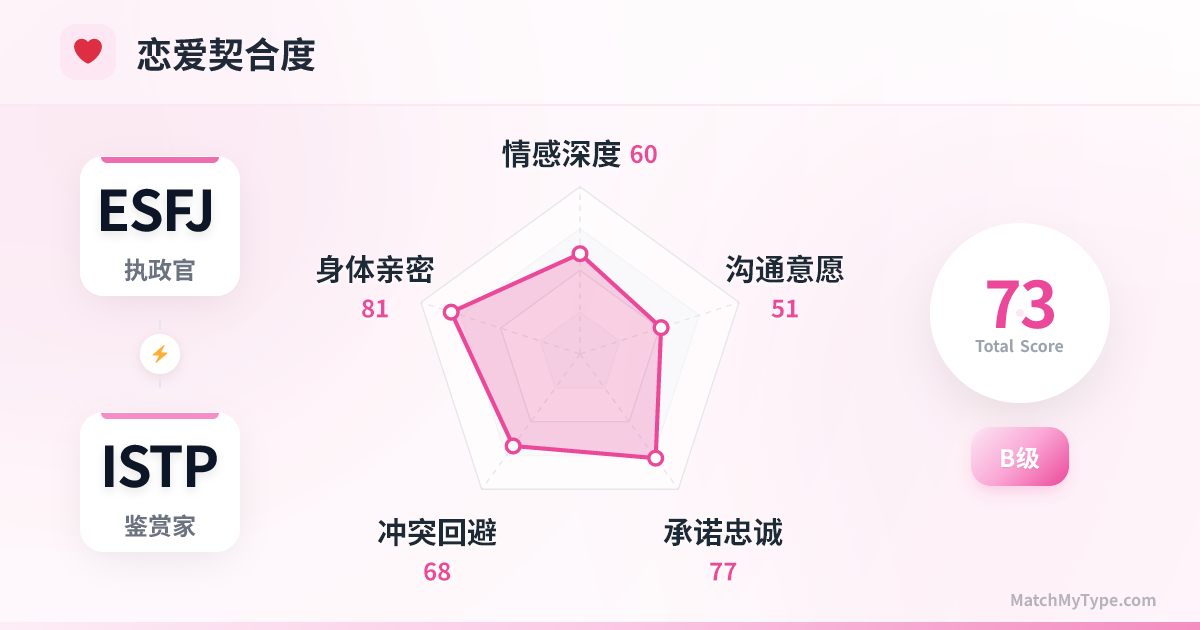 这是一场感性与理性的极致拉扯: **Fe (外倾情感) x Ti (内倾思考)**:这是最大的冲突点也是互补点。ESFJ 的 Fe 极其在意“氛围”和“他人评价”,倾向于通过言语确认关系;而 ISTP 的 Ti 只在乎“逻辑”和“事实”,极其反感肉麻的情话和复杂的社交礼仪。ESFJ 可能会觉得 ISTP “冷血、像个机器人”,ISTP 可能会觉得 ESFJ “情绪化、不讲道理”。 **Si (内倾感觉) x Se (外倾感觉)**:ESFJ 的 Si 喜欢按部就班、遵循传统和计划(比如提前一个月定好旅行);ISTP 的 Se 追求刺激、活在当下和随机应变(比如到了机场再买票)。生活中,一个想建立秩序,一个想打破束缚。