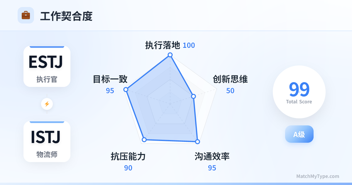 完美的“前台与后台”搭配。ESTJ 擅长制定战略、对外谈判、统筹大局;ISTJ 擅长审核细节、流程控制、风险管理。ESTJ 敢于冲锋陷阵,ISTJ 确保粮草先行。在财务、法律、工程、行政等需要严谨和规则的领域,你们是无敌的。