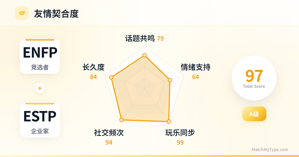 两块充满电的电池。你们都喜欢热闹,喜欢认识新朋友。ENFP 负责搞怪和开启话题,ESTP 负责耍帅和控场。你们可以连续玩三天三夜不休息,是彼此最佳的“派对战友”。
