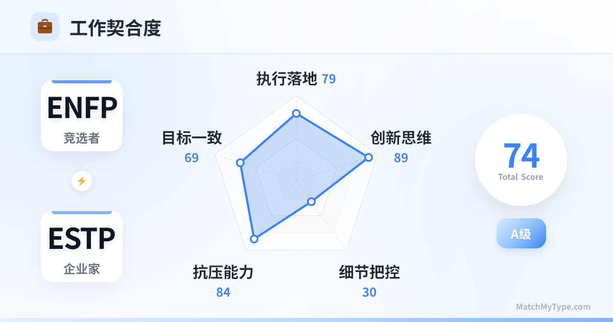 实干狼性。ESTP 老板看重结果和效率,说话直接。ENFP 员工可能会觉得老板太冷酷、缺乏人文关怀。ESTP 需要多夸奖 ENFP 的创意,少批评他们的情绪,ENFP 才会卖力工作。