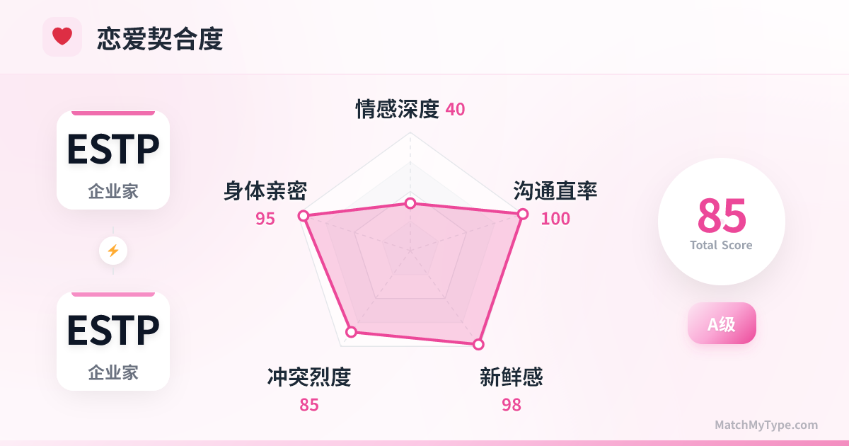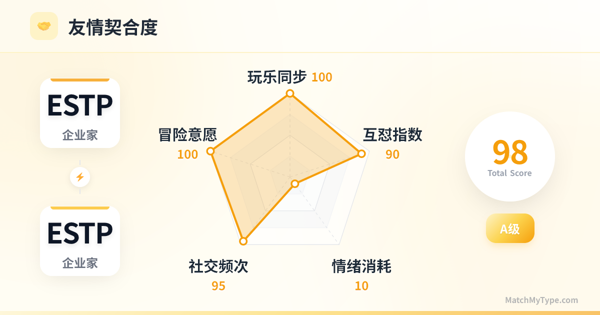 极致的效率与破局能力。当公司面临突发危机或需要迅速攻占市场时,两个 ESTP 能在没有方案的情况下直接冲上前线,凭直觉和经验解决问题。沟通成本极低,一个眼神就知道该怎么配合忽悠客户。