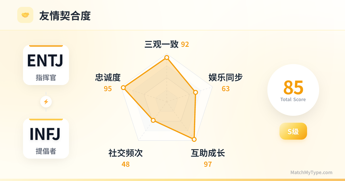 这是「力量」与「智慧」的结合。ENTJ 习惯了在前面冲锋陷阵,内心却渴望有一个能理解其宏大愿景且不被吓跑的伴侣;INFJ 拥有看透人心的X光眼,能瞬间穿透 ENTJ 强硬的盔甲,看到那个渴望改变世界的理想主义内核。ENTJ 给了 INFJ 敢于行动的勇气和安全感,INFJ 给了 ENTJ 缺失的情感润滑和精神指引。