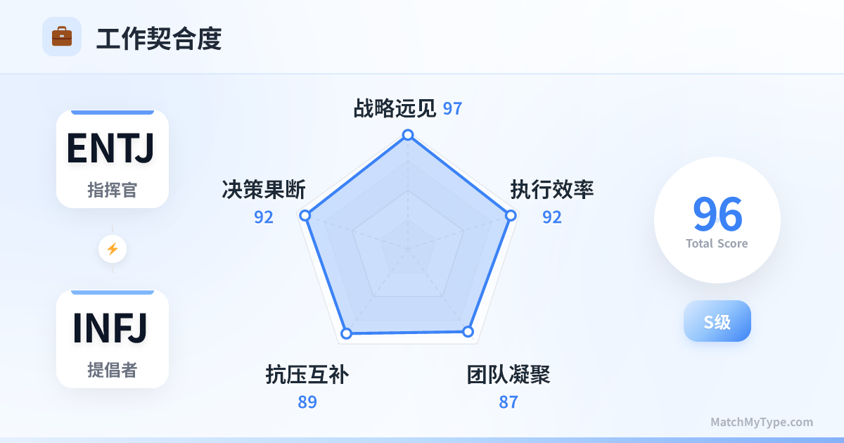 战略闭环。ENTJ 擅长制定战略、分配资源、推进进度;INFJ 擅长洞察人心、预测风险、构建企业文化。ENTJ 负责“硬实力”,INFJ 负责“软实力”。在创业、咨询、管理层搭档中,这种互补是毁灭级的优势。