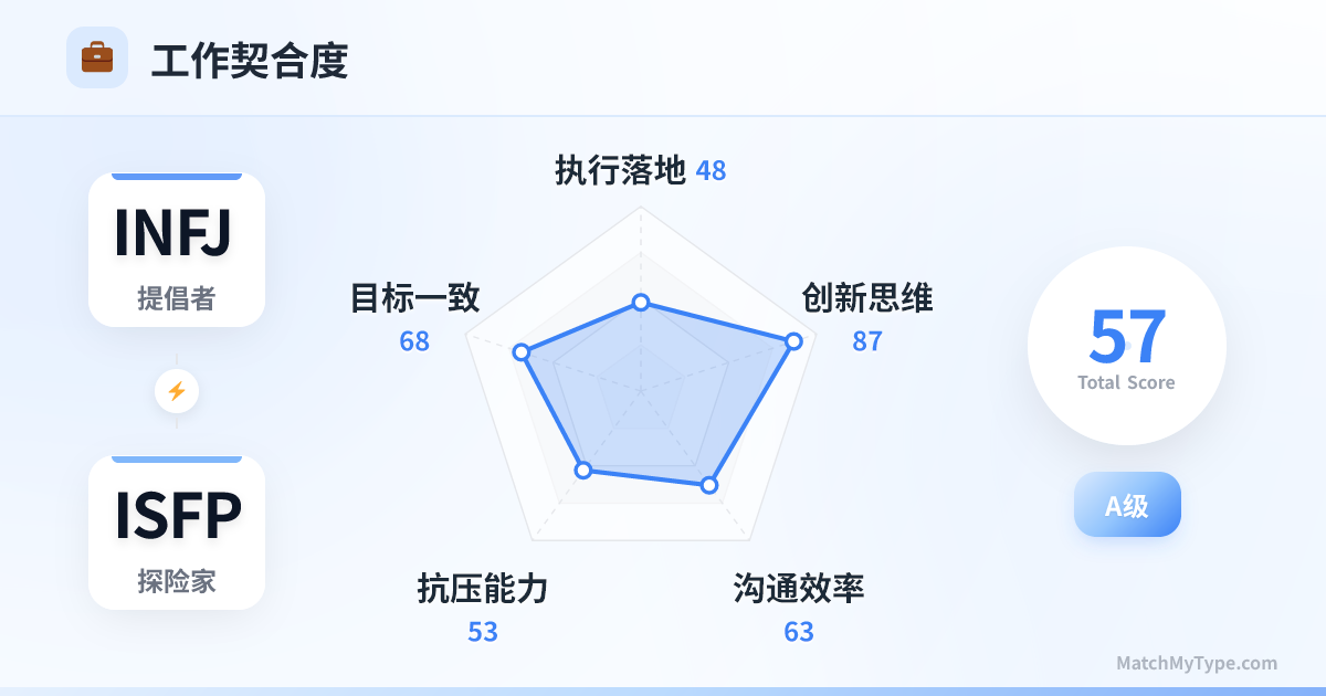 互不打扰的默契。两人都讨厌办公室政治,喜欢安静地做自己的事。最佳合作模式是:INFJ 搞定客户需求和框架逻辑,ISFP 负责具体的执行制作。切记不要一起开冗长的头脑风暴会,否则会变成“沉默大会”。