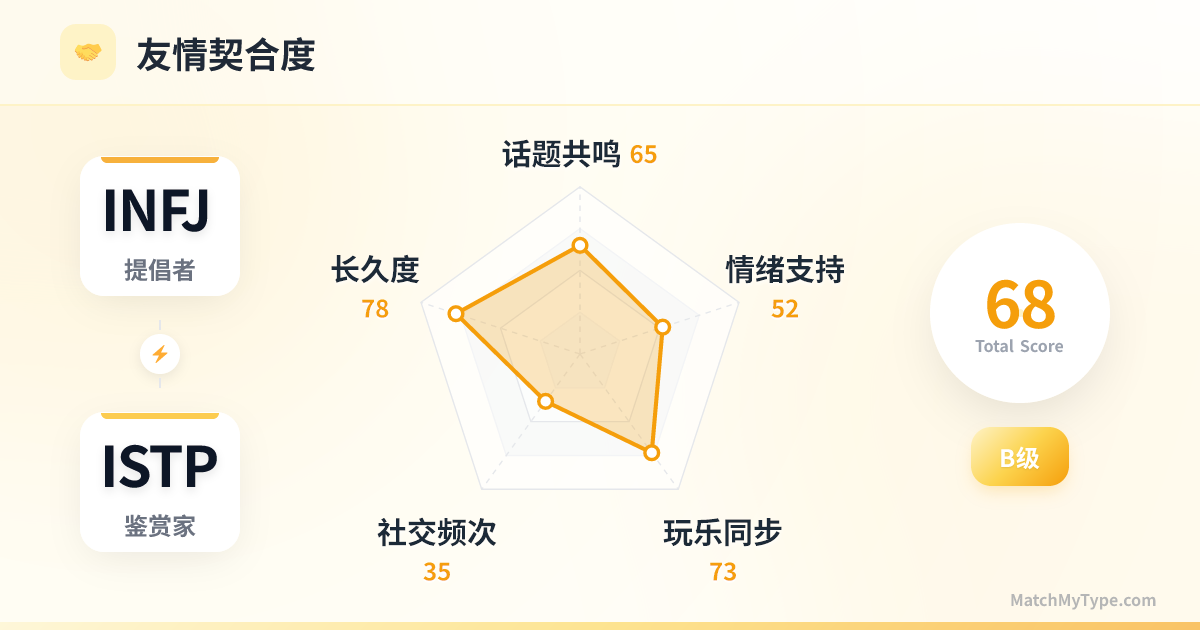 这是“军师”与“特种兵”的组合。INFJ 擅长宏观战略、洞察人心和危机预判;ISTP 擅长战术执行、技术攻坚和临场应变。只要目标一致,你们能搞定最复杂的项目。