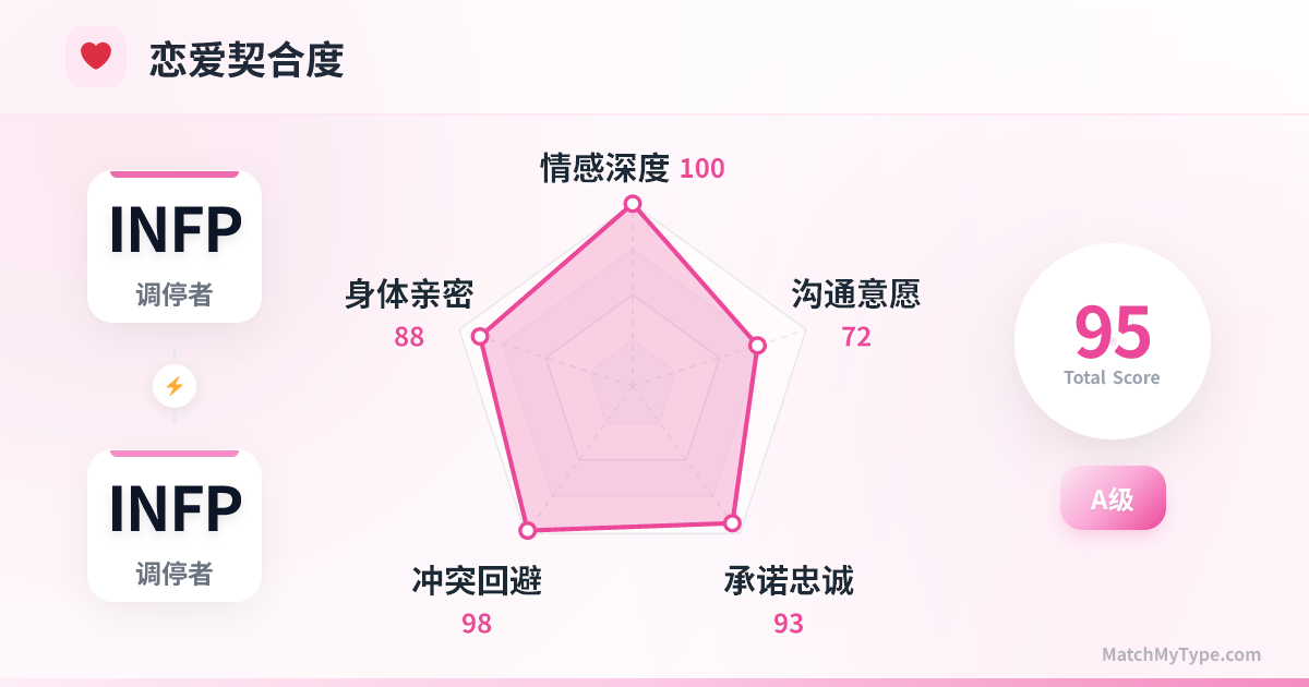 这是一场镜像对局: **Fi (内倾情感) x Fi (内倾情感)**:这是最核心的连接点,也是最大的隐患。优点在于你们能达到人类情感共鸣的极限,能够感知对方微米级的情绪波动。缺点在于,Fi 是极其主观和以自我为中心的,如果两人的核心价值观(Values)发生冲突,这将是一场没有硝烟的冷战,双方都会固执地认为自己才是道德的高地,且都不愿妥协。 **Ne (外倾直觉) x Ne (外倾直觉)**:你们在一起可以构建最宏大的梦想世界,从某种乌托邦式的未来到奇幻小说的设定。但也因为缺乏收束功能,你们的计划往往永远停留在“想”的阶段,容易一起陷入脱离现实的空想循环。 **Te (外倾思考) 缺失**:这是双 INFP 最大的软肋。两人都在劣势功能 Te 上挣扎,意味着面对生活琐事、金钱管理、决策制定时,两人都会本能地逃避。这可能导致生活环境混乱、财务危机,最后被现实压垮。