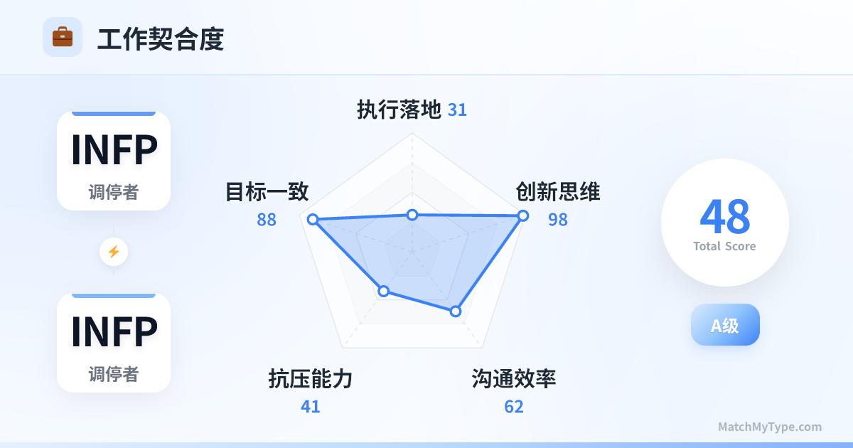 极度缺乏结构感和时间观念。如果一个项目完全由两个 INFP 负责,很可能会面临无限期的延期、预算失控以及细节上的粗糙。在面对高压竞争或需要冷酷决策(如裁员、谈判)时,两人都会因为心软和逃避而崩溃。