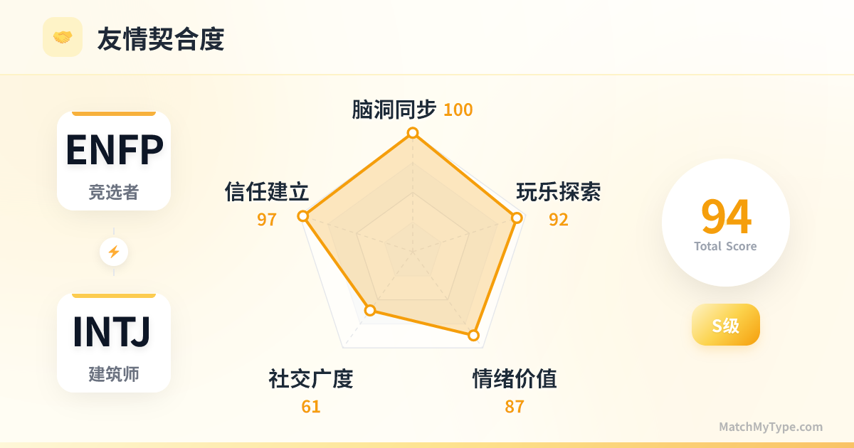 ENFP 是 INTJ 的“社交挂件”和“人类翻译机”。在聚会中,INTJ 通常面无表情地站在角落,ENFP 则负责把有趣的人带到 INTJ 面前,或者帮 INTJ 挡掉无聊的寒暄。ENFP 知道何时该把 INTJ 拉出来透气,INTJ 知道何时该把喝醉的 ENFP 拖回家。这是一种默契的能量守恒。