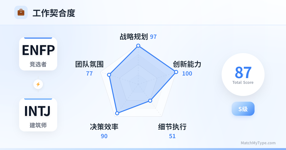 最佳拍档。建议 ENFP 负责对外(路演、销售、PR),INTJ 负责对内(产品、研发、风控)。开会时,ENFP 负责活跃气氛和发散思维,INTJ 负责总结陈词和制定 Action List。
